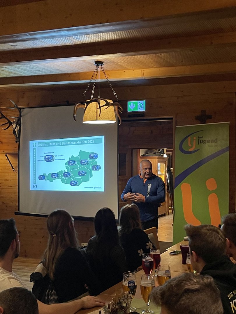 Herr Dipl.-Ing. Rainer Grubelnik, Sicherheitsbeauftragter für Forstwirtschaft bei der Sozialversicherung der Selbstständigen (SVS), führte mit spannenden Vorträgen durch die Veranstaltung. Dabei spannte er den Bogen von aktuellen Unfallstatistiken in der Land- und Forstwirtschaft über Ausbildungsangebote und die richtige Rettungskette bei Unfällen bis hin zur optimalen Arbeitsplatzabsicherung. Besonders betonte er die Bedeutung der Persönlichen Schutzausrüstung (PSA) und empfahl regelmäßige Auffrischungskurse in Sachen Arbeitssicherheit, um Risiken im Arbeitsalltag zu minimieren.