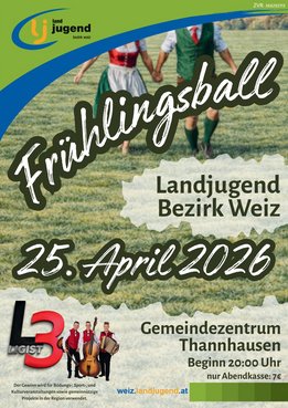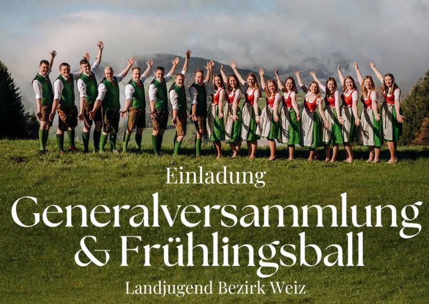 Die Landjugend Bezirk Weiz lädt euch herzlich zur Generalversammlung mit anschließendem Frühlingsball der Landjugend Bezirk Weiz am 25. April 2026 im Gemeindezentrum Thannhausen ein.