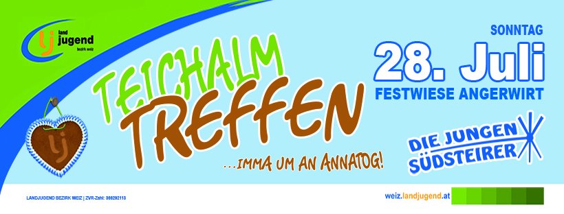 Wir, die Landjugend Bezirk Weiz, möchten Euch recht herzlich zum Teichalmtreffen 2019, auf der Festwiese beim Angerwirt einladen. - Sonntag, 28. Juli 2019 - Festwiese beim Angerwirt Ablauf: * 09:30 Marschkonzert der Ortskapelle Gutenberg * 10:00 Hl. Messe mit Pfarrer Mag. Karl Rechberger * 11:00 Festakt * 13:30 Tanz und Unterhaltung mit "Die jungen Südsteirer" * 15:00 Volkstanzen * 17:00 Siegerehrung der Publikums-Wettbewerbe Auf Euer Kommen freut sich die Landjugend Bezirk Weiz.